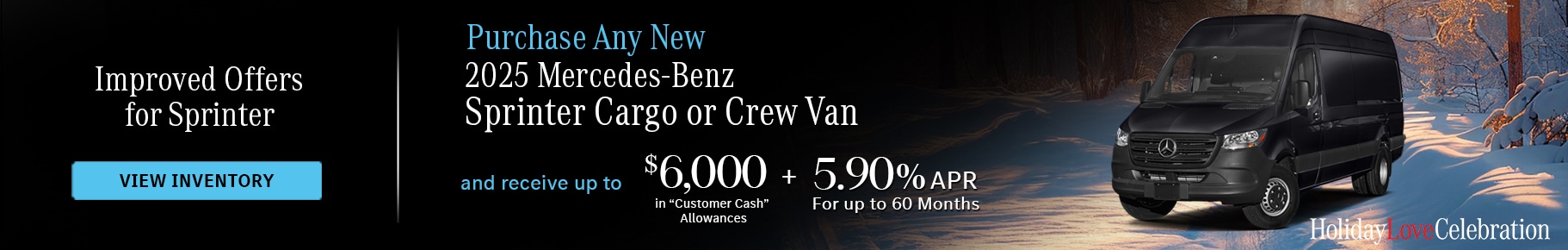 $6,000 Customer Cash available on new 2025 Mercedes-Benz Sprinter Cargo Van and Crew Van vehicles (excluding eSprinter Cargo Van and Sprinter Passenger Van models) purchased from dealer stock. Dealer price may vary. See participating dealer for details. May not be combined with other offers except where specified. May be combined the Mercedes-Benz Commercial Vehicles Medium Fleet Program. Customers who participate in Special Lease do not qualify for Customer Cash. Customer Cash offer ends February 2, 2026. Only valid on new 2025 Mercedes-Benz Sprinter Cargo Van and Crew Van vehicles (excluding eSprinter Cargo Van and Sprinter Passenger Van models) purchased from dealer stock. Qualified commercial customers only. 5.90% APR financing for 60 months at $19.29 per month, per $1,000 financed. Combinable with applicable Customer Cash offer from Mercedes-Benz USA, LLC (MBUSA). Excludes leases and balloon contracts and National Fleet customers. Available only at participating authorized Mercedes-Benz Vans dealers through Mercedes-Benz Financial Services (MBFS). Must take delivery of vehicle by February 2, 2026. Specific vehicles are subject to availability and may have to be ordered. Subject to credit approval by MBFS. Actual rates, terms, down payment, and program eligibility will be determined by MBFS Credit Team based upon creditworthiness of customer. Program rates or terms may be changed or the program may be terminated at any time at the sole discretion of MBFS. Offer is subject to limits on the total amount financed. See your authorized Mercedes-Benz Vans dealer for complete details on this and other finance offers. Offer valid through February 2, 2026.